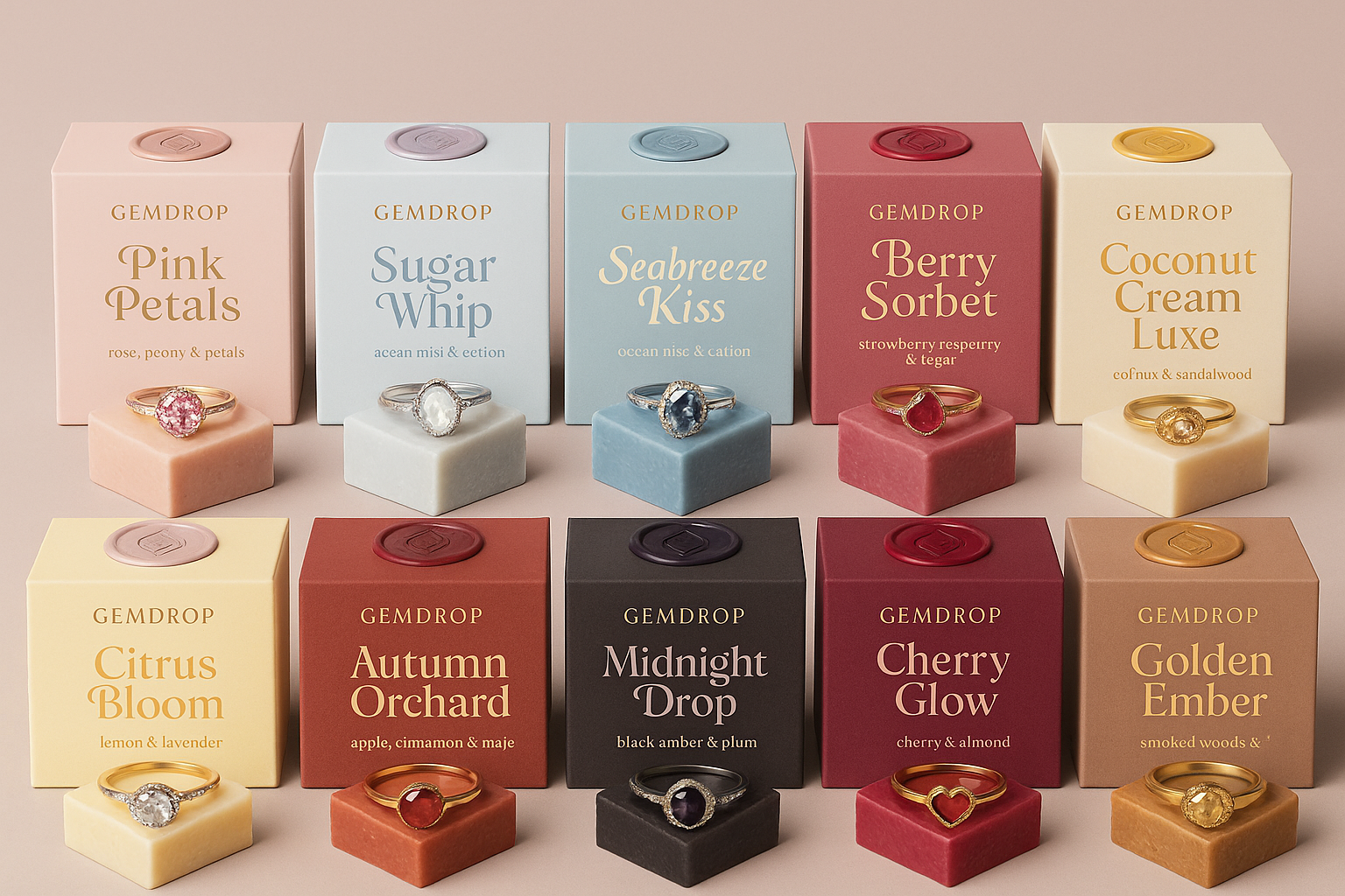 Each handcrafted wax cube holds a hidden sterling silver or lab-created gemstone ring—sealed under wax with a luxurious gold monogram. Reveal via a Wax Melter at home or join a live stream. Rings come in sizes S–M–L.